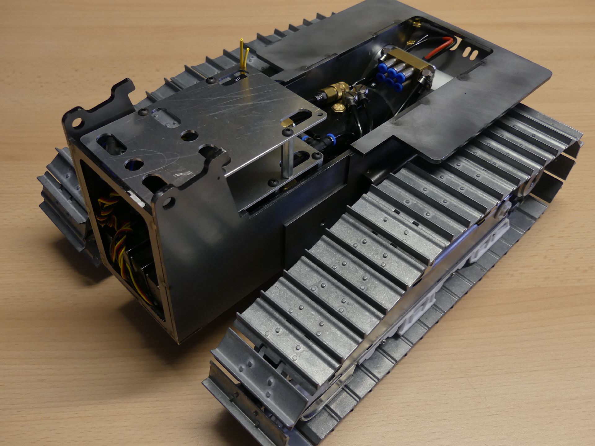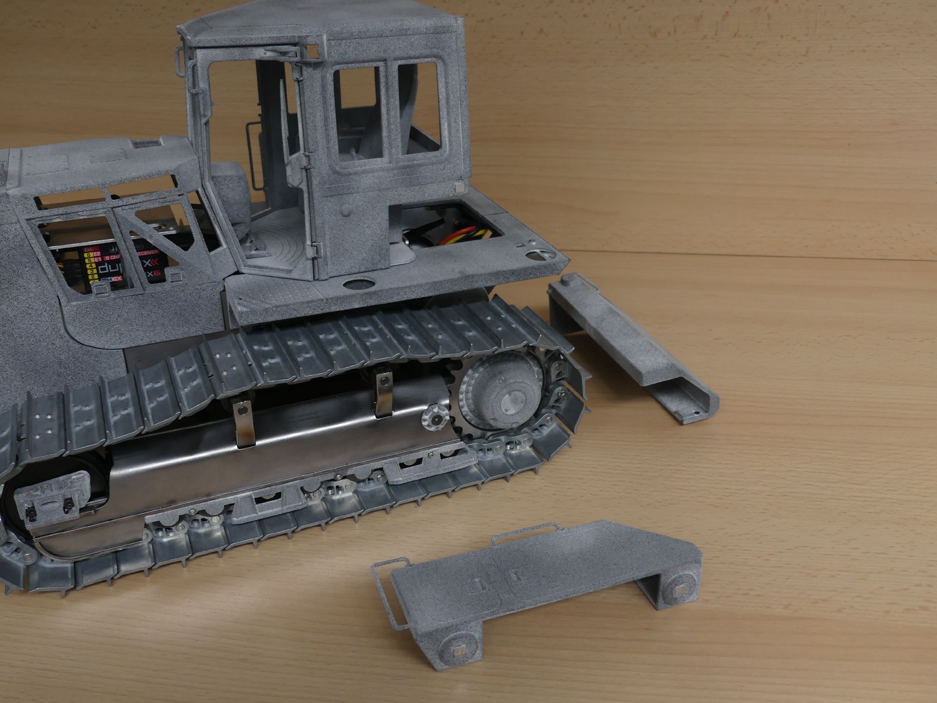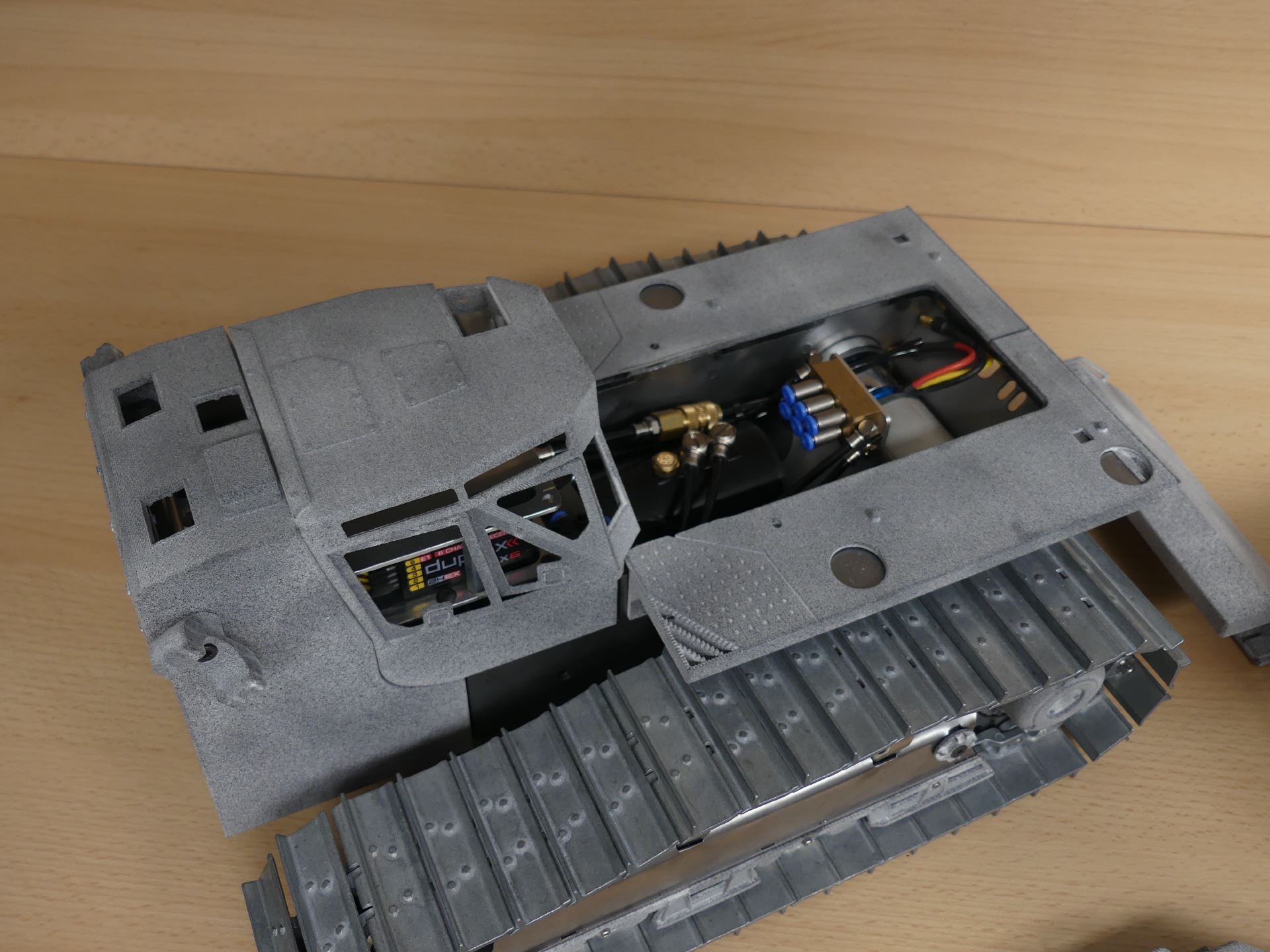 Aber auch "unter der Haube" hat sich einiges getan. Die Hydraulikeinheit wurde komplett neu entworfen, ist nun viel kompakter und bietet auf den RC-Decks reichlich Platz für die Fernsteuerkomponenten und Soundmodul. Auch für den Einbau des Lautsprechers ist direkt hinter dem Kühlergrill ein Platz vorgesehen.