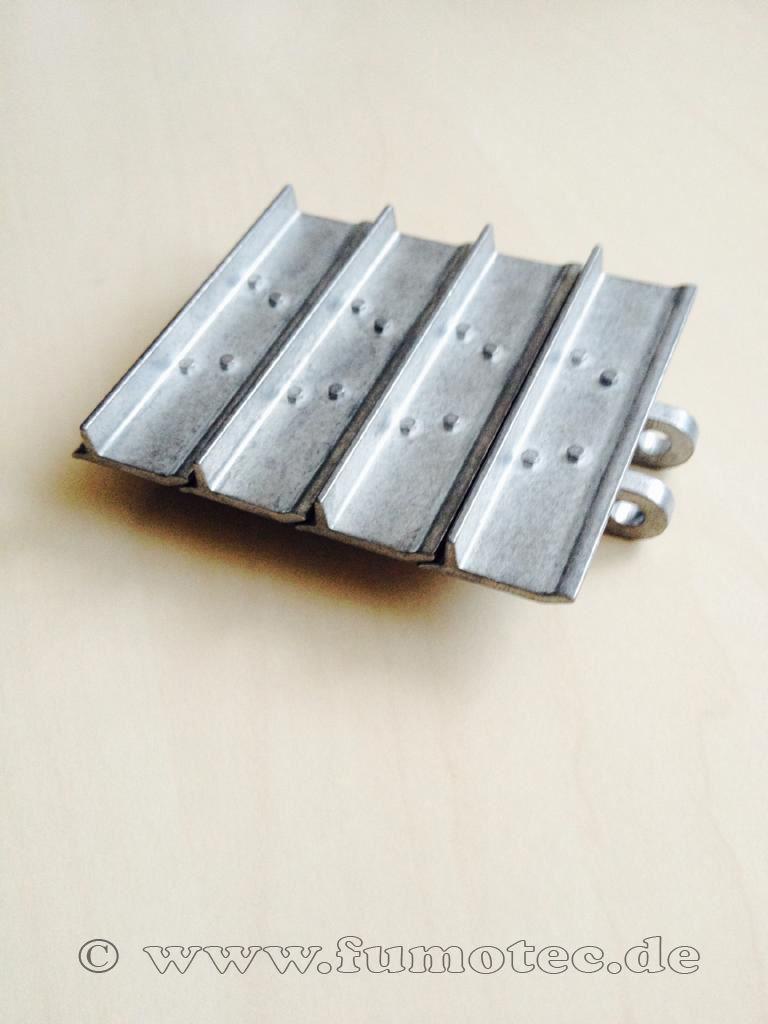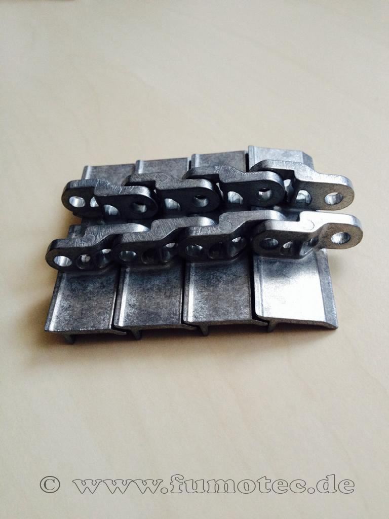 1-Steg Metallkettenglied inkl. Bolzen. Technische Daten: Kettenbreite 52,5mm, 4mm Kettenbolzen, Teilung : 8mm (16mm Kettenbolzenabstand).