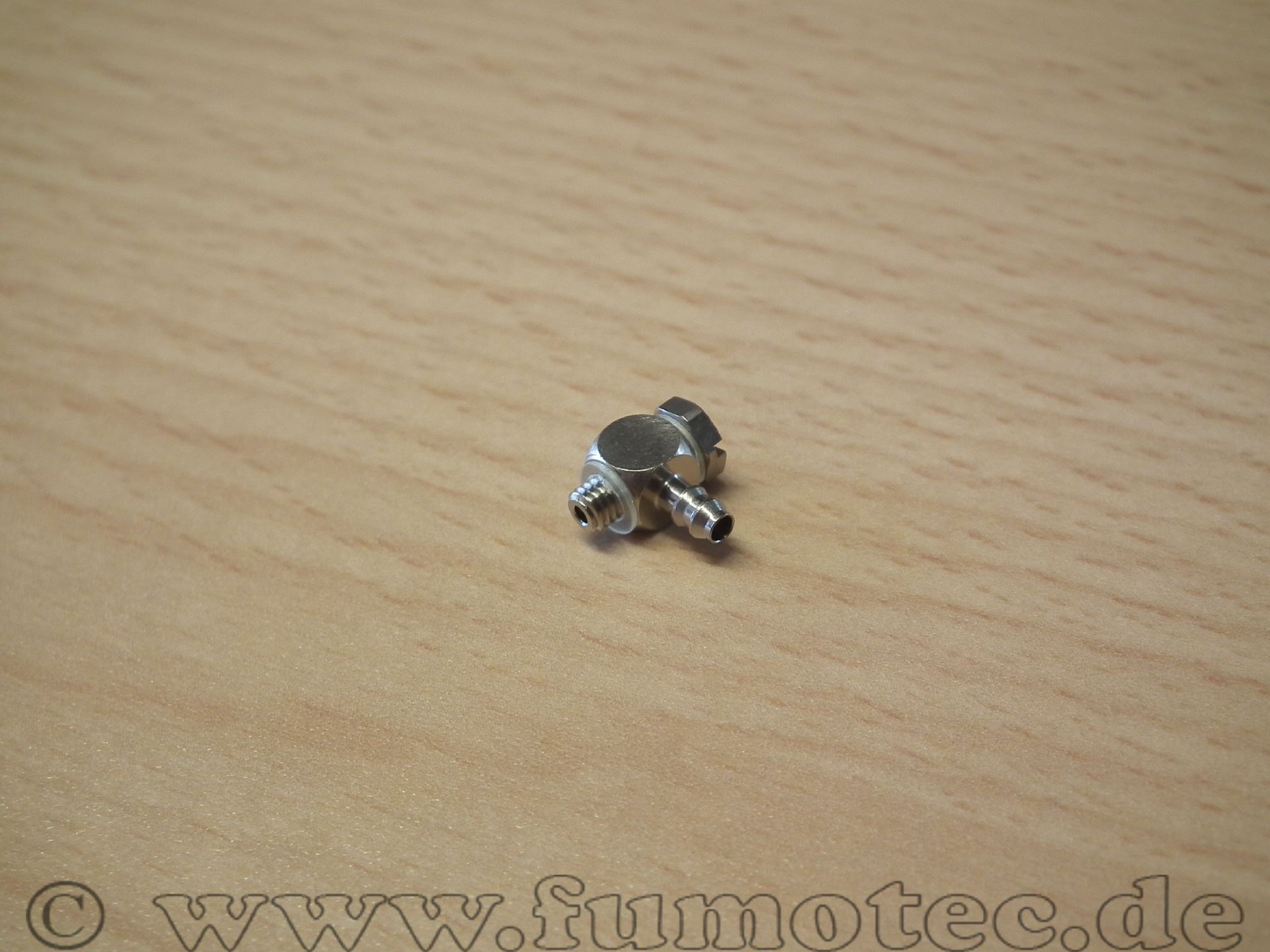 Winkelanschluß 90°, Anschluß 360° freipositionierbar Technische Daten: Gewinde: M3x2mm, Schlauchanschluß: für 3mm Schlauch, passende Sicherungstülle Bestell-Nr. 15-99