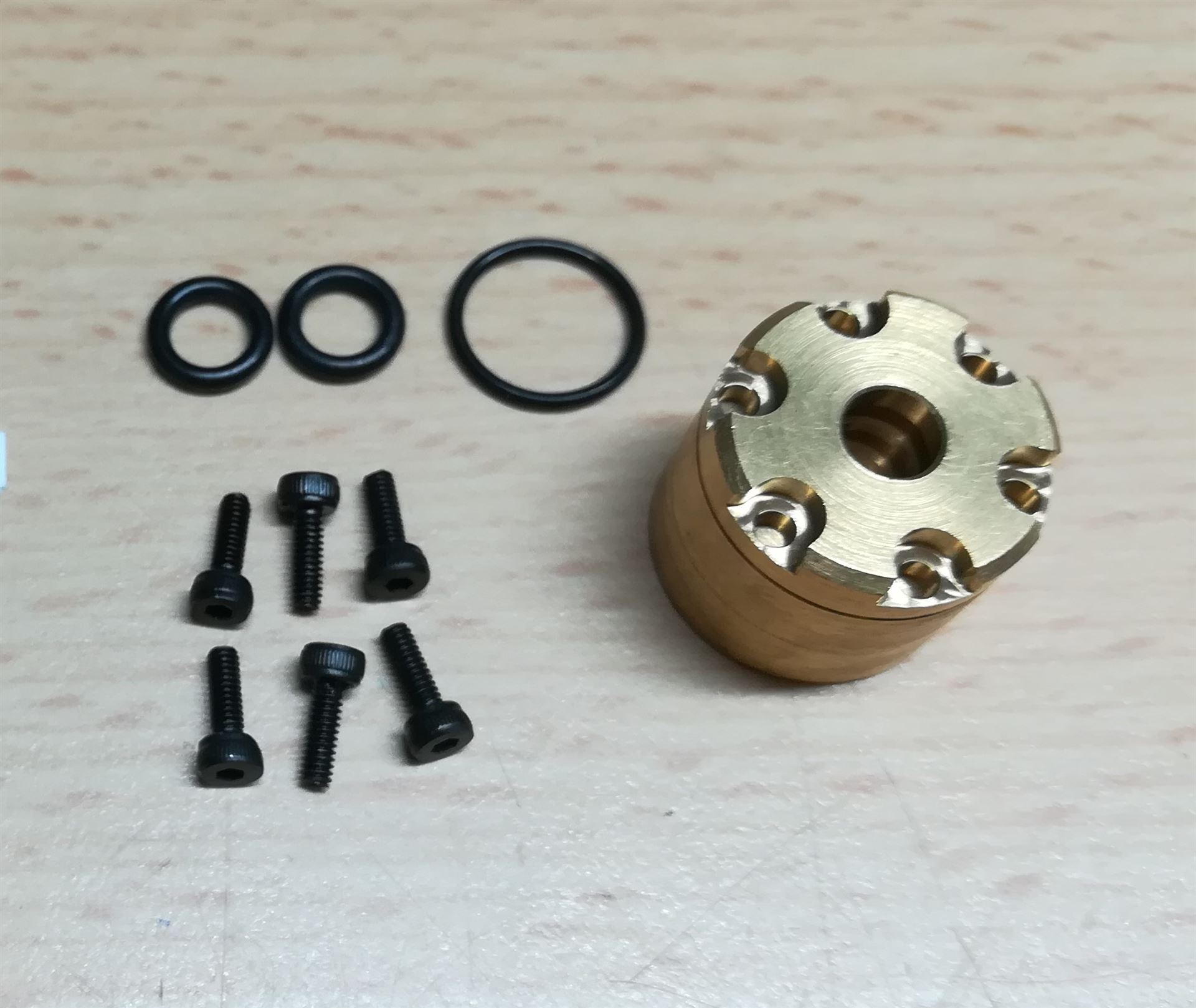 Mehrteiliger Zylinderkopf geeignet für 14mm, Zylinderrohr, 5mm Kolbenstange und Ø 7mm Ölanschlüsse. Lieferumpfang wie abgebildet
