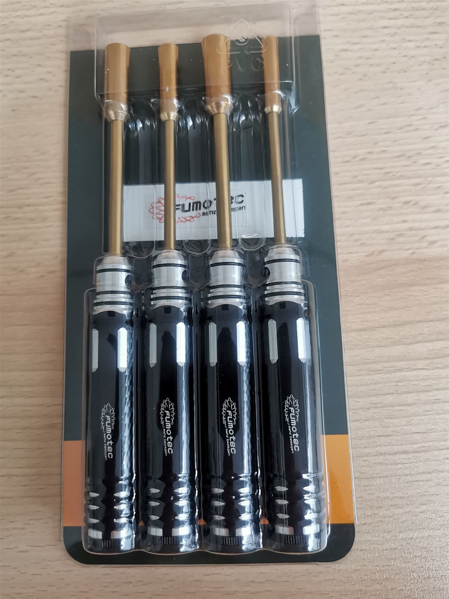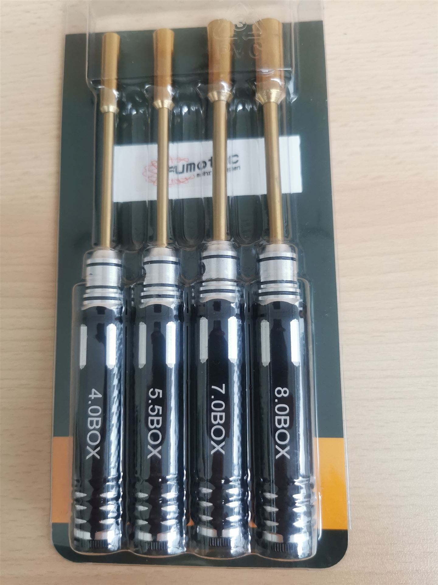 Hochwertiges Werkzeugset, Einsätze aus gehärtetem Stahl mit hochfester Beschichtung, folgende Größen enthalten 4,0 – 5,5 - 7,0 - 8,0. Lieferung in praktischer Sortierablage