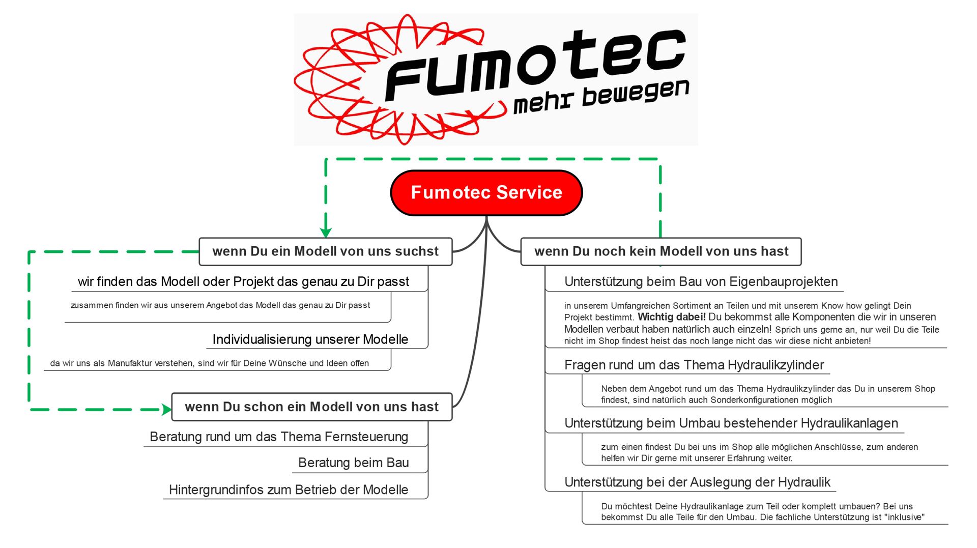 Klar bieten wir Dir tolle Modelle in allen Varianten und Ausführungen (vom unlackierten Bausatz bis hin zum individuellen Fertigmodell) Dazu gibt es aber noch den Fumotec Service! Viele von Euch kennen und schätzen diesen schon seit Jahren, aber wir haben auch regelmäßig Kunden die uns sagen: „Hätte ich das gewusst……“ . Auf dem Bild findest Du einen groben Überblick, über das was wir Dir neben unseren bekannten Produkten bieten. Teste unseren Service gerne selbst!