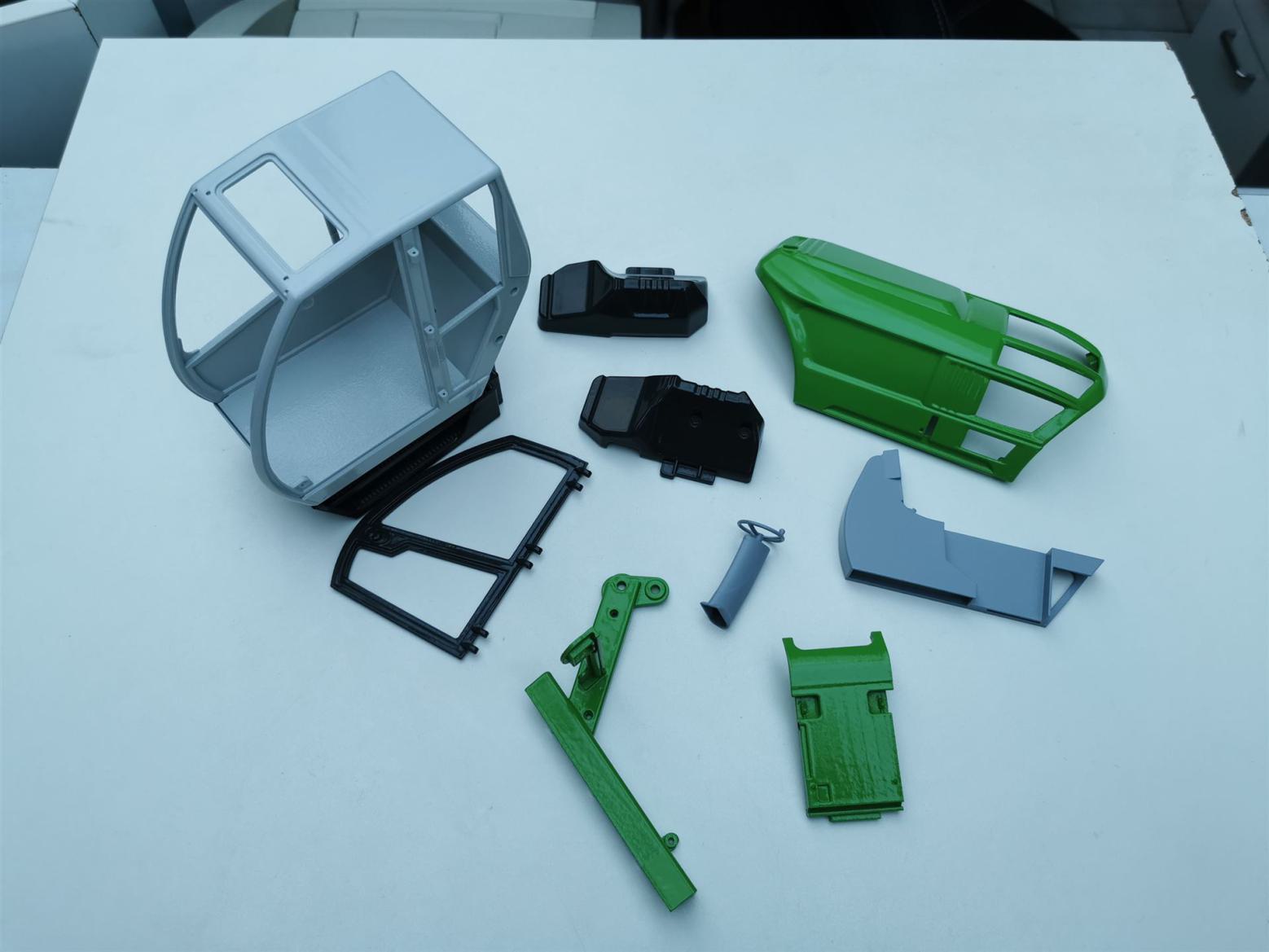 Im Lieferumfang: unlackierter Bausatz inkl. der zum Bau erforderlichen Komponenten (Hydraulik, Antriebe usw.), sowie eine Schaufel mit gerader Schneide. Siehe Galerie - Bausatzinhalt